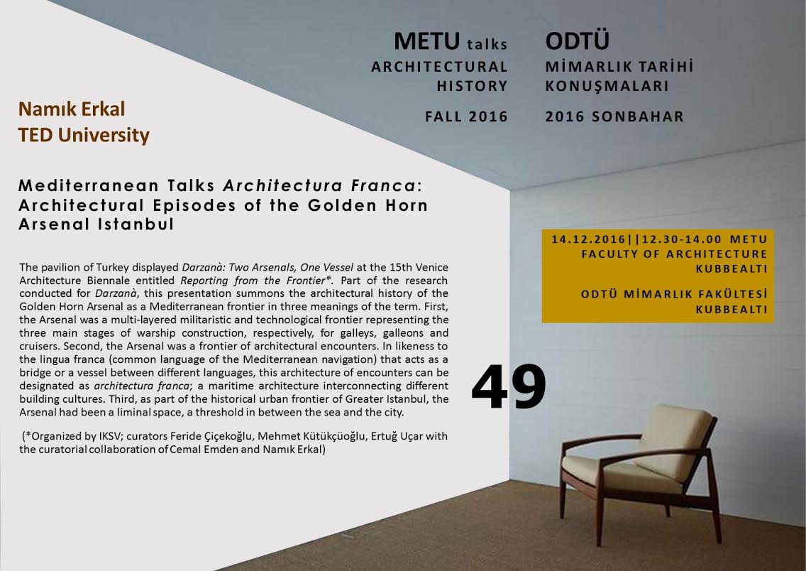 49. Namık Erkal from TED University lectured on "Mediterranean Talks Architectura Franca: Architectural Episodes of the Golden Horn Arsenal Istanbul" on 14 December 2016 Thursday in Kubbealtı (DOME)