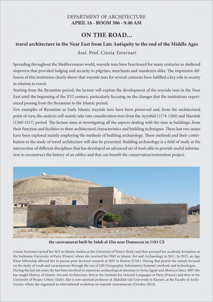 39. Cinzia Tavernari, Abdullah Gül Üniversitesi (April, 16, 2015) "On the Road: Travel Architecture in the Near East from Late Antiquity to the End of the Middle Ages"