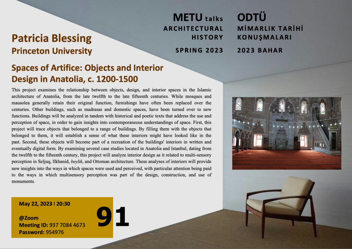 91. Patricia Blessing "Spaces of Artifice: Objects and Interior Design in Anatolia, c.1200-1500" on May 22, 2023 @Zoom.
