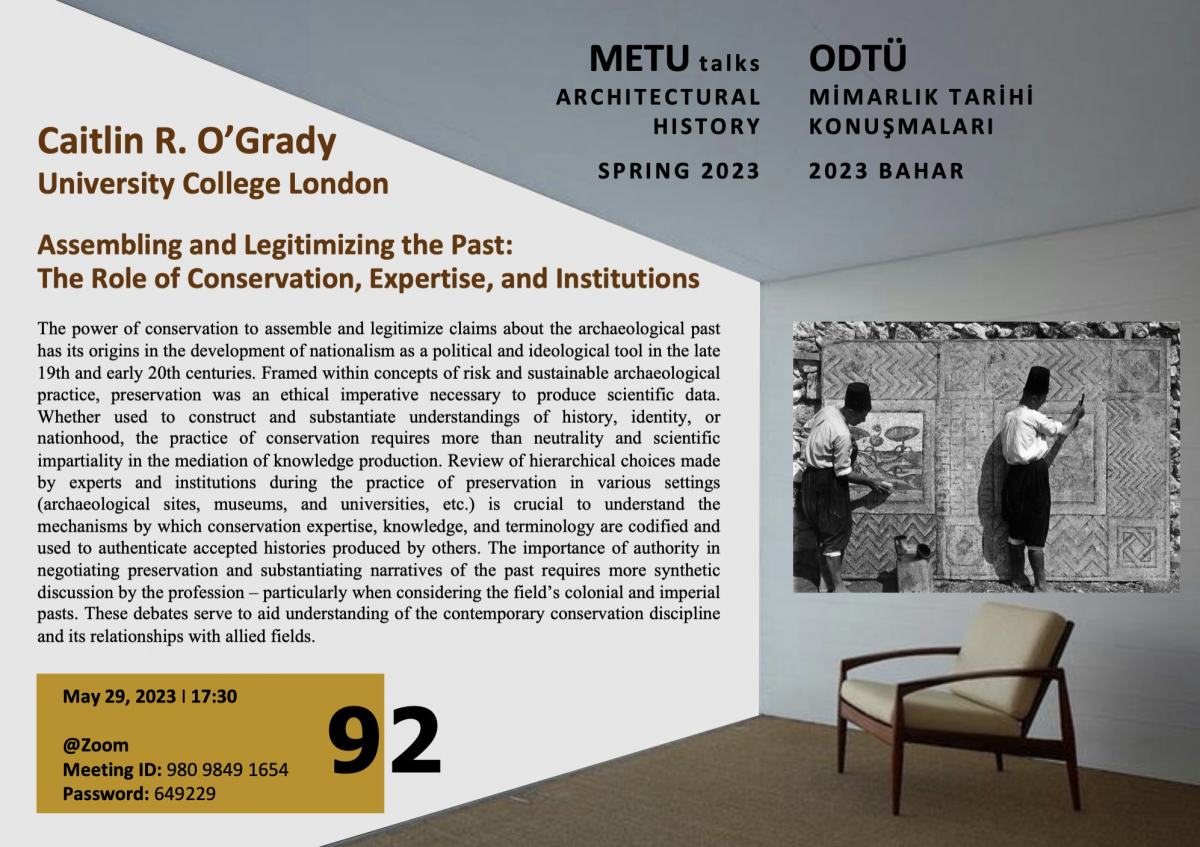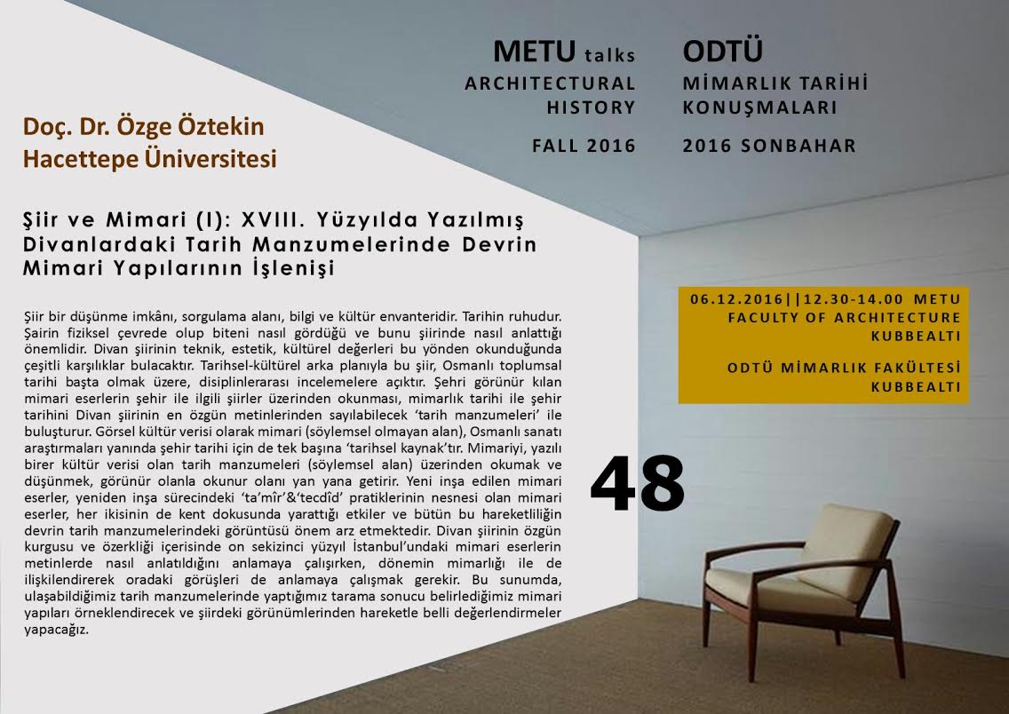 METU Graduate Program in Architectural History organizes a series of talks on architectural history. The lectures aim to provide a ground of knowledge and discussion about current research on different study fields of architectural history.