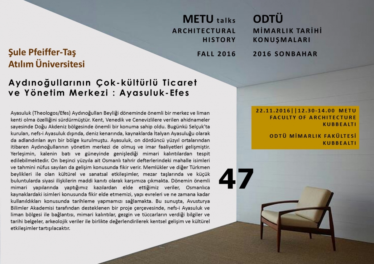 47. Şule Pfeiffer-Taş from Atılım University lectured on “Aydınoğullarının Çok-kültürlü Ticaret ve Yönetim Merkezi : Ayasuluk-Efes” on 14 November 2016 Tuesday in Kubbealtı (DOME)
