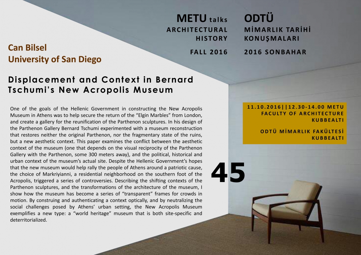 45. Can Bilsel from University of San Diego lectured on “Displacement and Context in Bernard Tschumi’s New Acropolis Museum” on 11 October 2016 Tuesday, 12:30 in Kubbealtı (Dome)