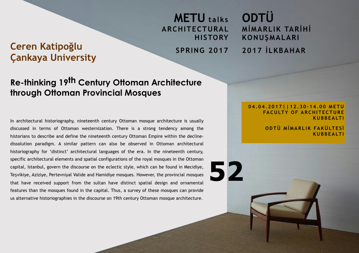 52. Ceren Katipoğlu from Çankaya University lectured on “Re-thinking 19th Century Ottoman Architecture through Ottoman Provincial Mosques” on 4 April 2017 Tuesday in Kubbealtı (DOME).