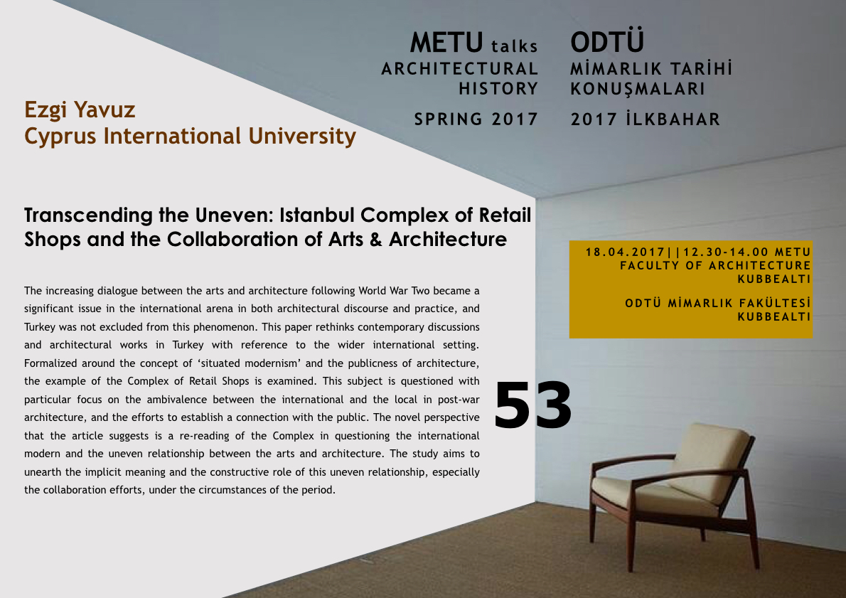 53. Ezgi Yavuz from Cyprus International University lectured on “Transcending the Uneven: Istanbul Complex of Retail Shops and the Collaboration of Arts & Architecture” on 18 April 2017 Tuesday in Kubbealtı (DOME).