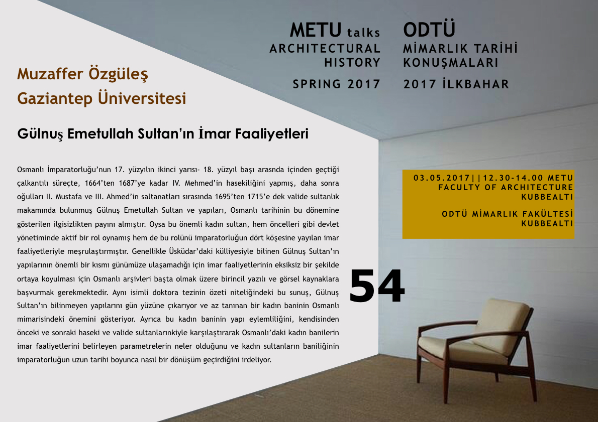 54. Muzaffer Özgüleş from Gaziantep University lectured on “Gülnuş Emetullah Sultan'ın İmar Faaliyetleri” on 3 May 2017 Wednesday in Kubbealtı (DOME).
