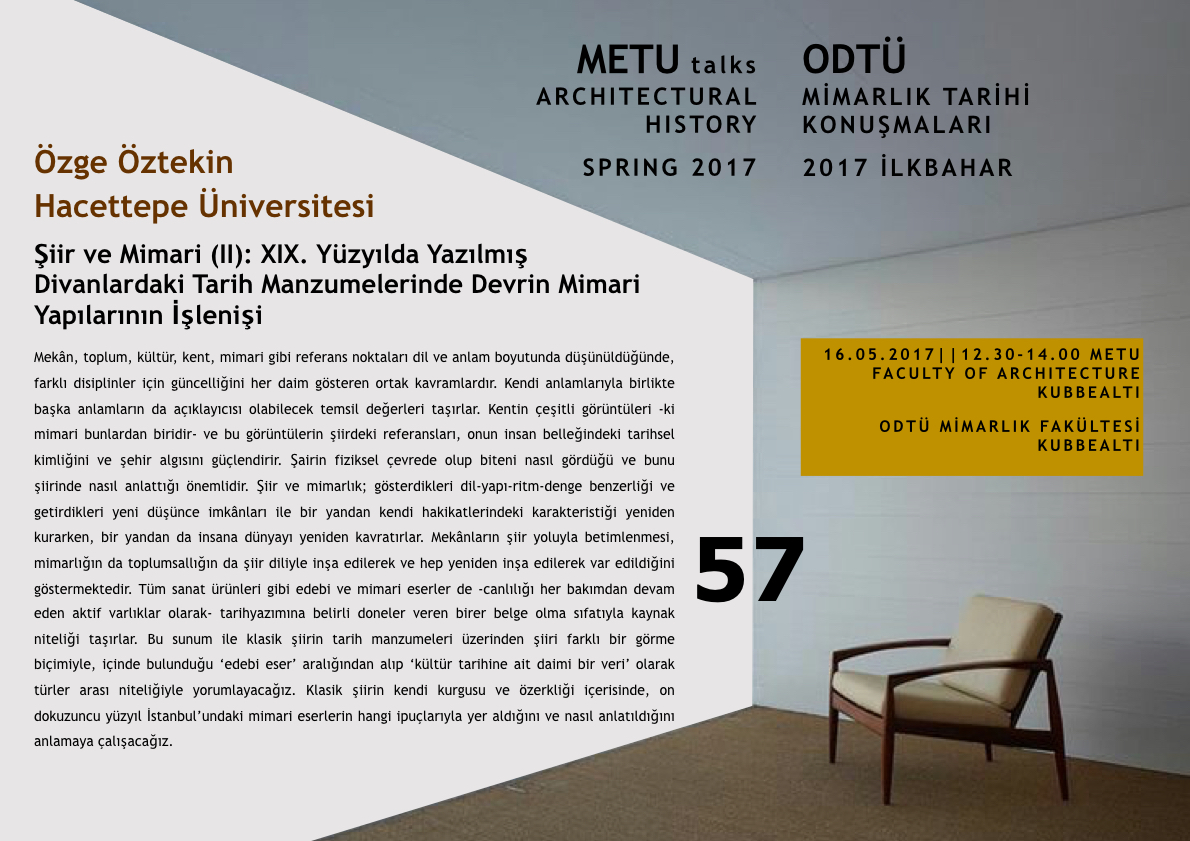 57. Özge Öztekin from Hacettepe University lectured on “Şiir ve Mimari (II): XIX. Yüzyılda Yazılmış Divanlardaki Tarih Manzumelerinde Devrin Mimari Yapılarının İşlenişi” on 16 May 2017 Tuesday in Kubbealtı (DOME).