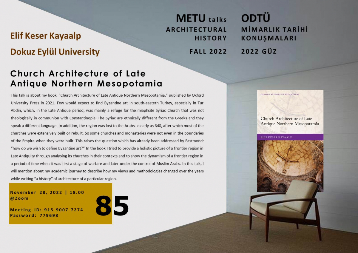 85. Elif Keser Kayaalp "Church Architecture of Late Antique Northern Mesopotamia" on November 28, 2022 @ Zoom.