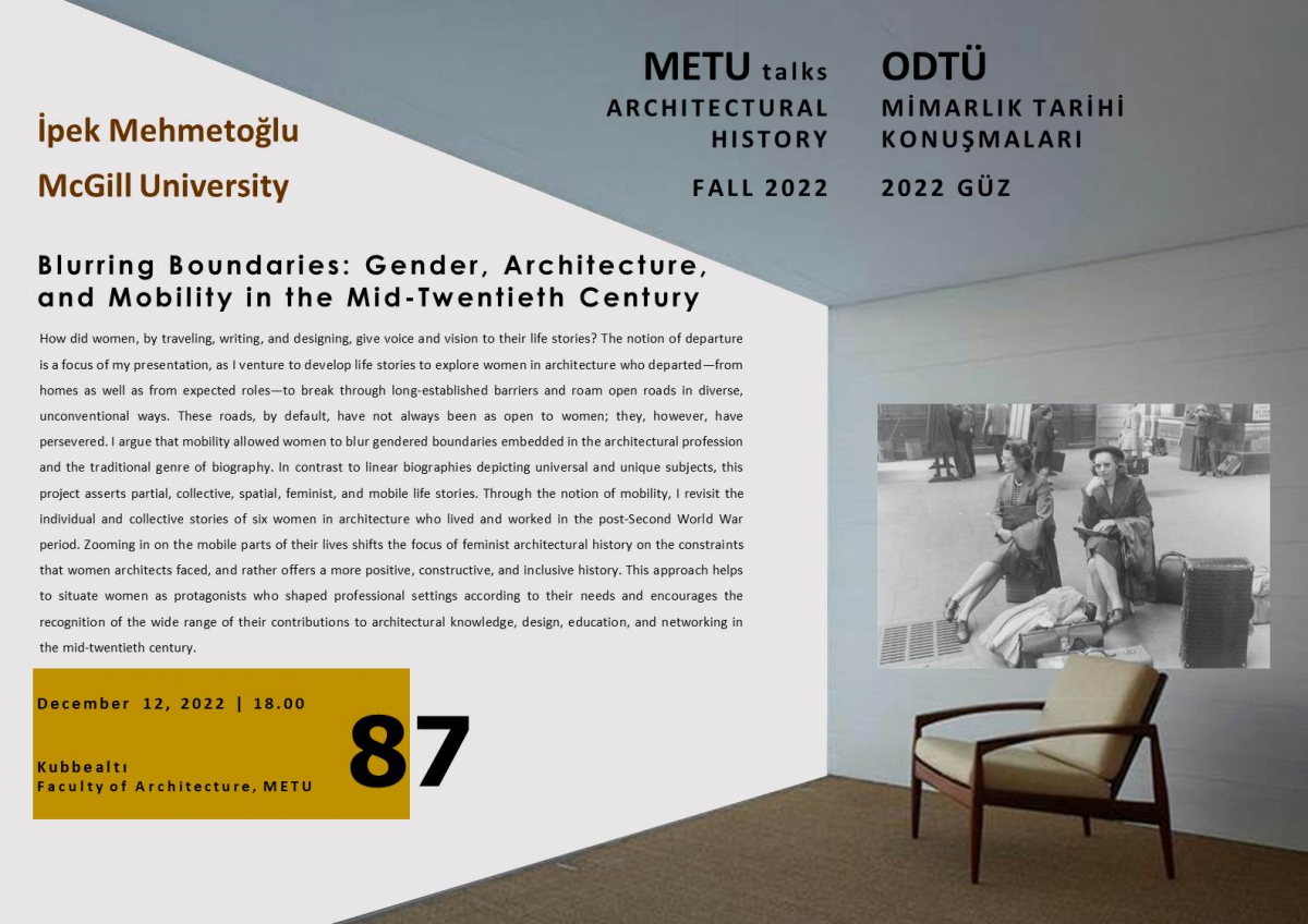 87. İpek Mehmetoğlu "Blurring Boundaries: Gender, Architecture, and Mobility in the Mid-Twentieth Century" on December 12, 2022 in Kubbealtı (DOME).