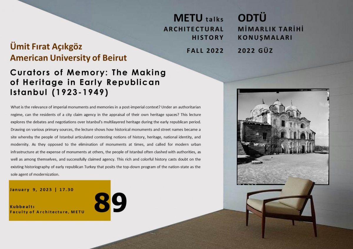89. Ümit Fırat Açıkgöz "Curators of Memory: The Making of Heritage in Early Republican Istanbul (1923-1949" on January 9, 2023 in Kubbealtı (DOME).