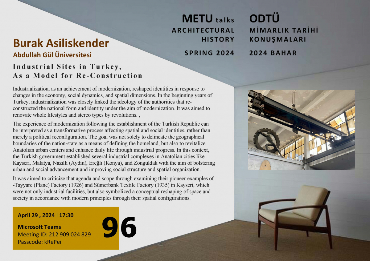 96. Burak Asiliskender "Industrial Sites in Turkey, As a Model for Re-Construction" on April 29, 2024 @Microsoft Teams.