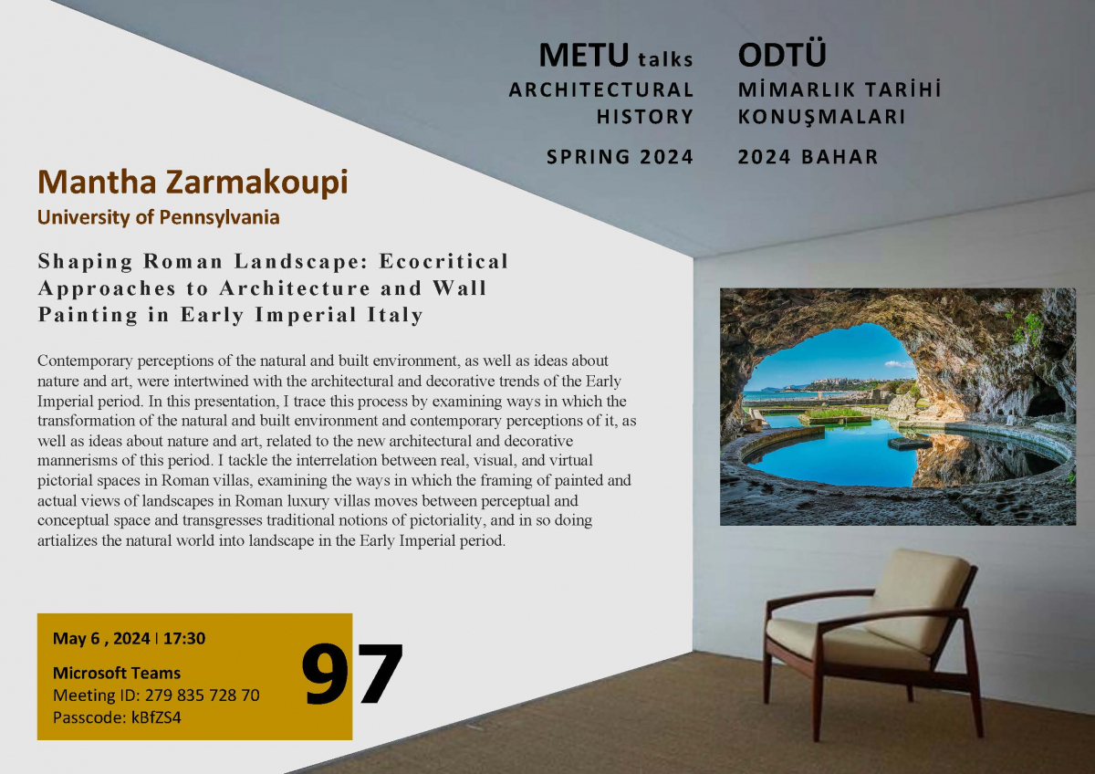 97. Mantha Zarmakoupi "Shaping Roman Landscape: Ecocritical Approaches to Architecture and Wall Painting in Early Imperial Italy" on May 6, 2024 @Microsoft Teams.