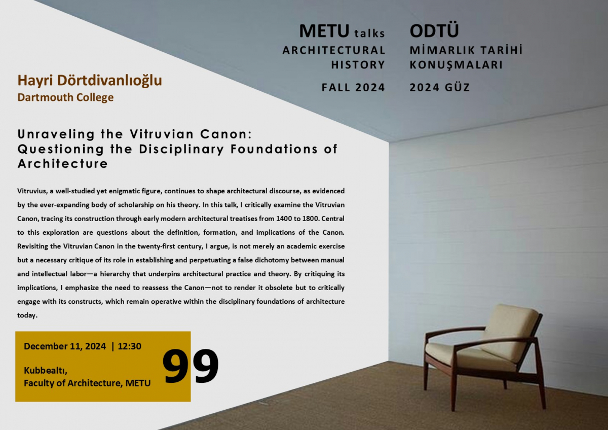 99. Hayri Dörtdivanlıoğlu "Unraveling the Vitruvian Canon: Questioning the Disciplinary Foundations of Architecture" on December 11, 2024 in Kubbealtı (DOME).