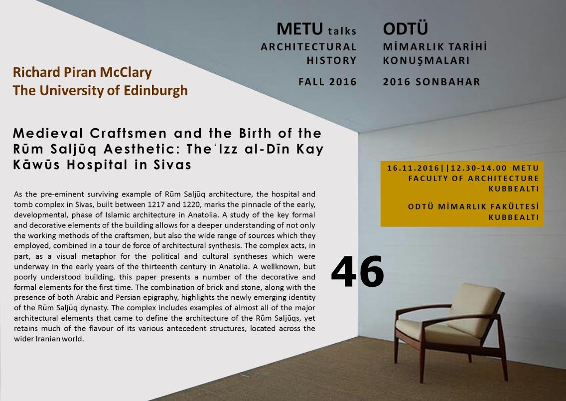 46. Richard Piran McClary form The University of Edinburgh lectured on “Medieval Craftsmen and the Birth of the Rūm Saljūq Aesthetic: The ʿIzz al-Dīn Kay Kāwūs Hospital in Sivas” on 16 November 2016 Wednesday in Kubbealtı (DOME)