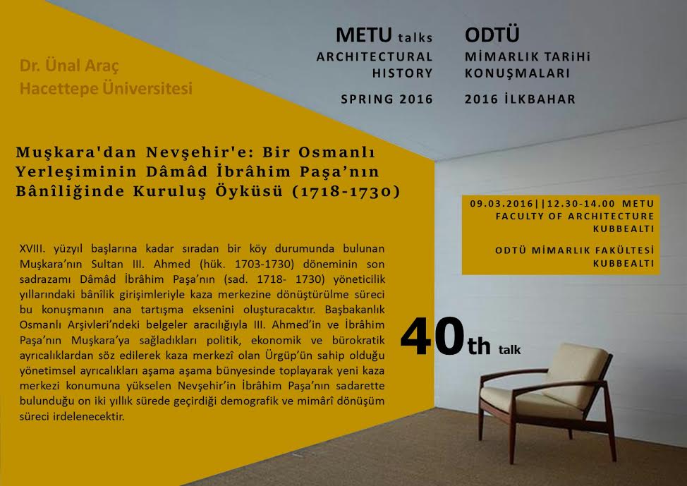 40. Ünal Araç, Hacettepe Üniversitesi (March 09, 2016) “Muşkara'dan Nevşehir'e: Bir Osmanlı Yerleşiminin Dâmâd İbrâhim Paşa’nın Bânîliğinde Kuruluş Öyküsü (1718-1730)”